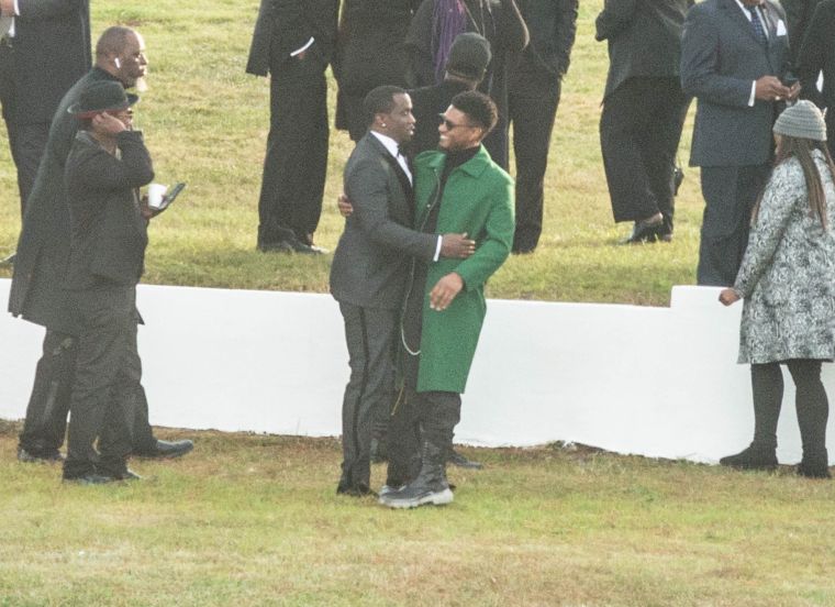 Sean “P Diddy” Combs and singer Usher with other mourners watch a fireworks display before Kim Porter is laid to rest at the Evergreen Memorial Cemetary in Columbus, Georgia.
